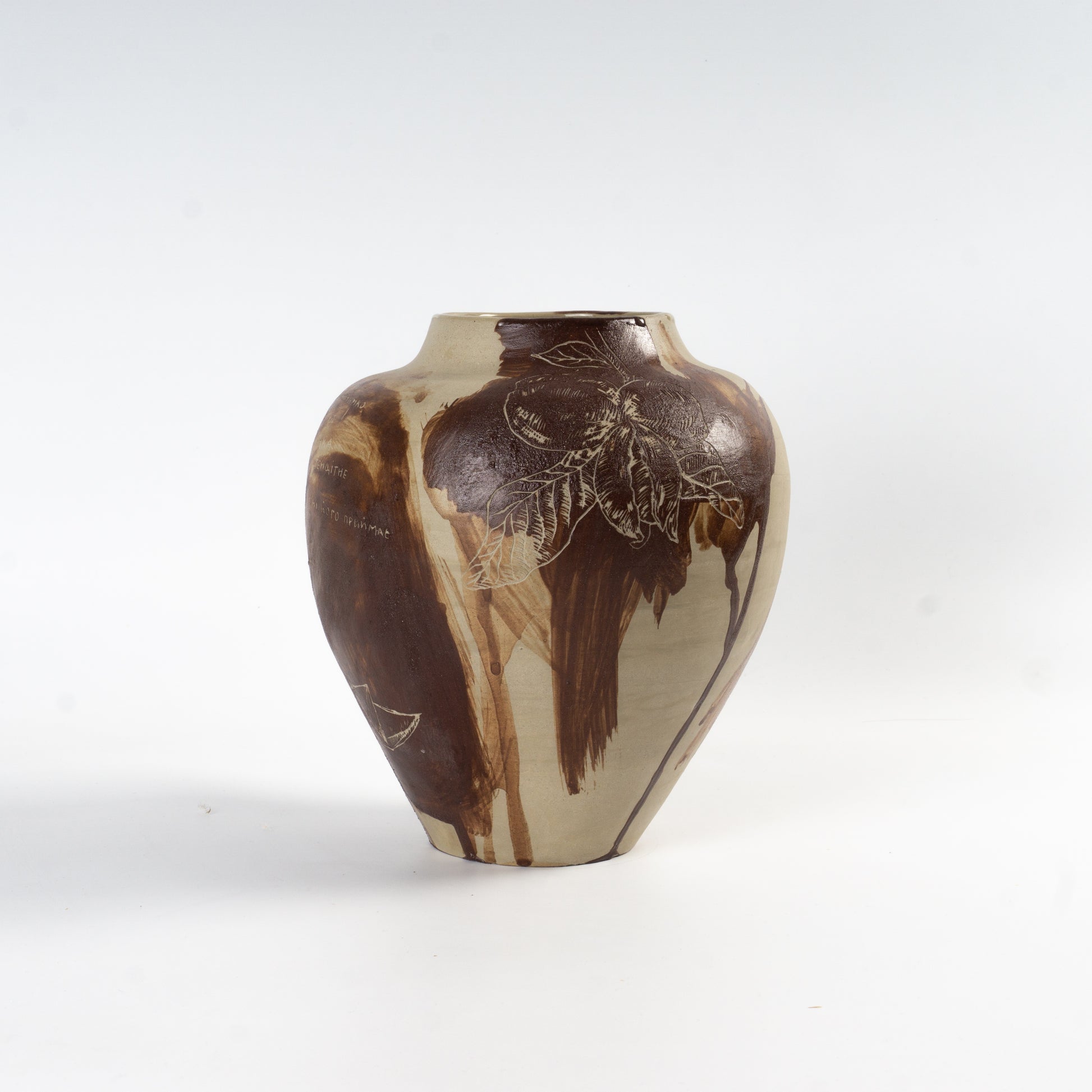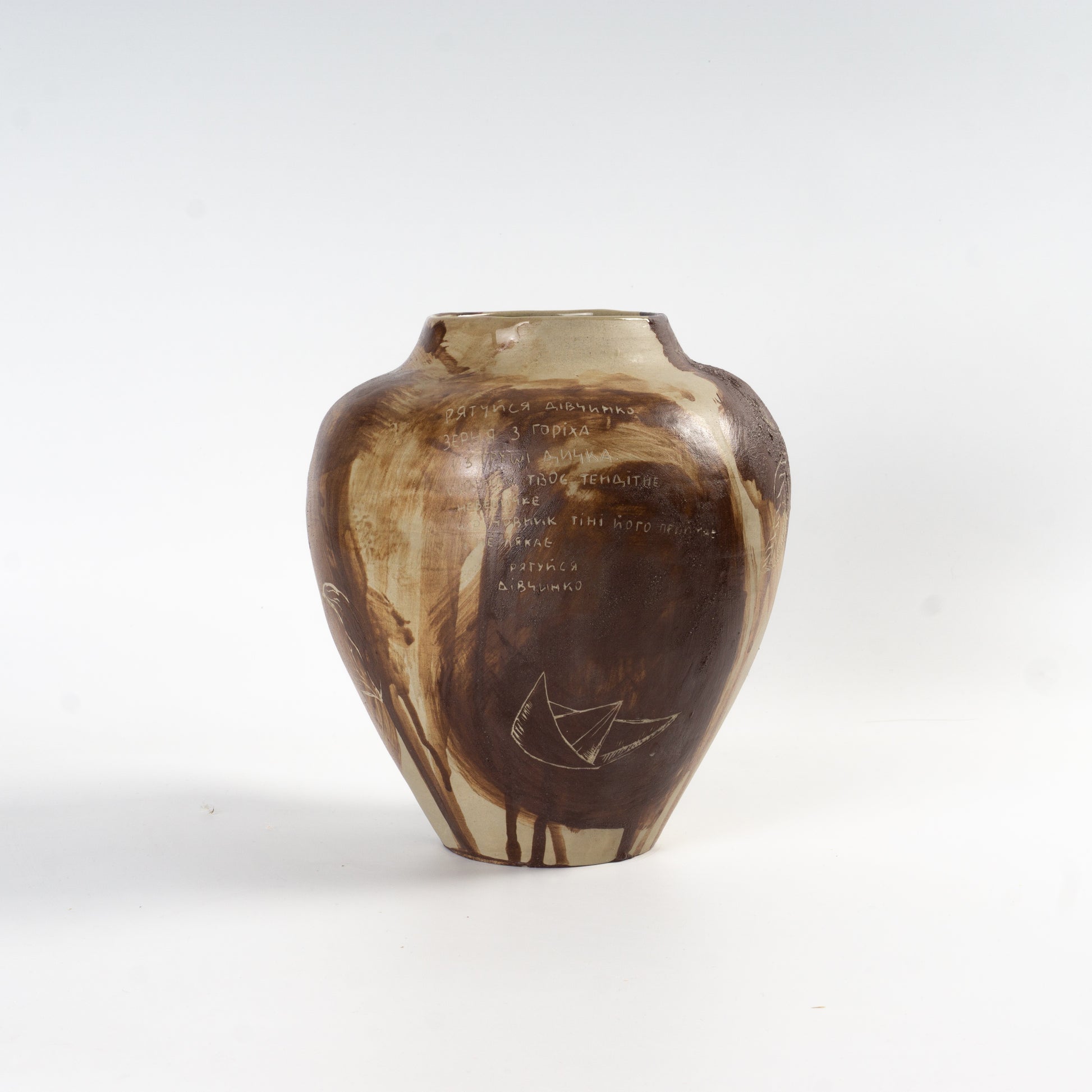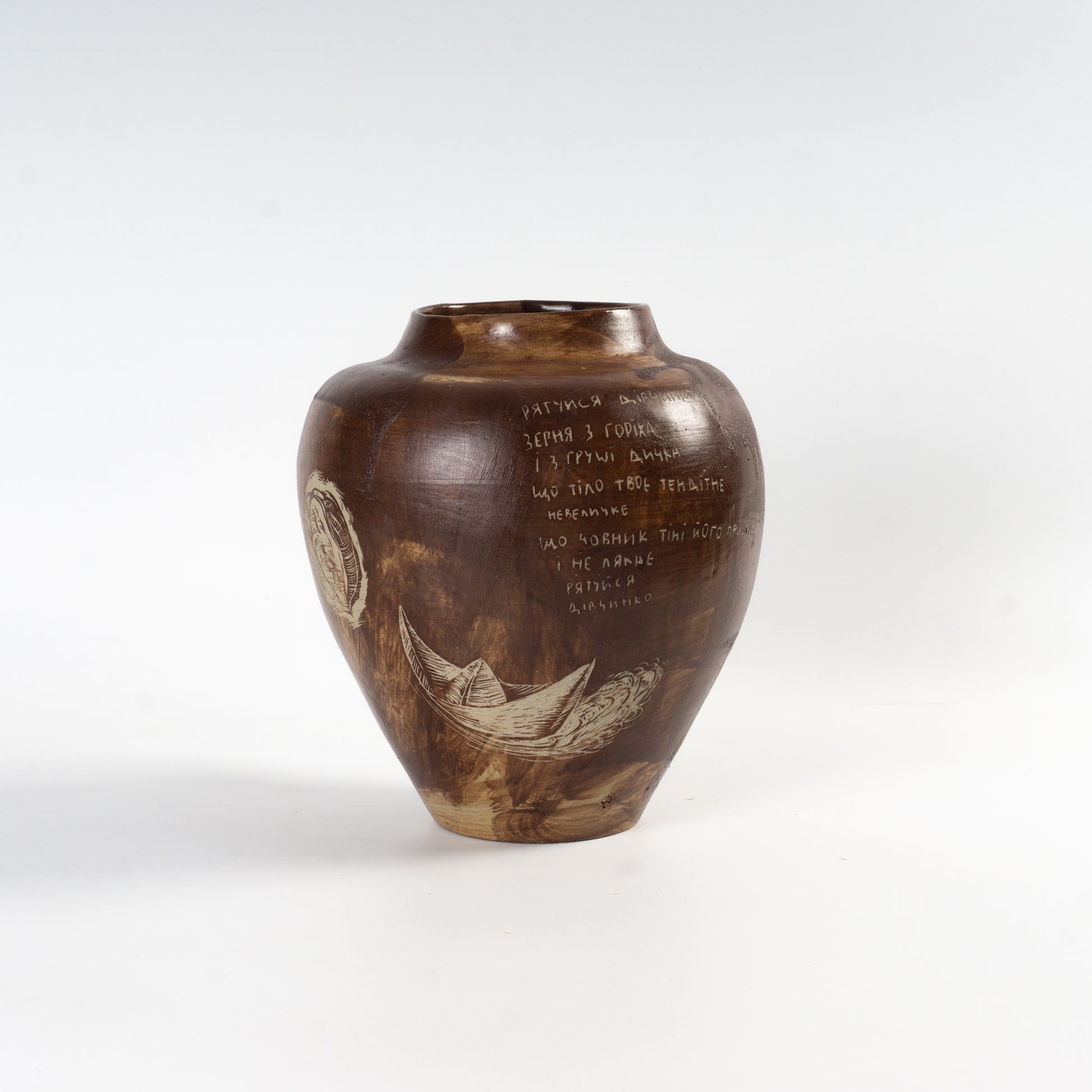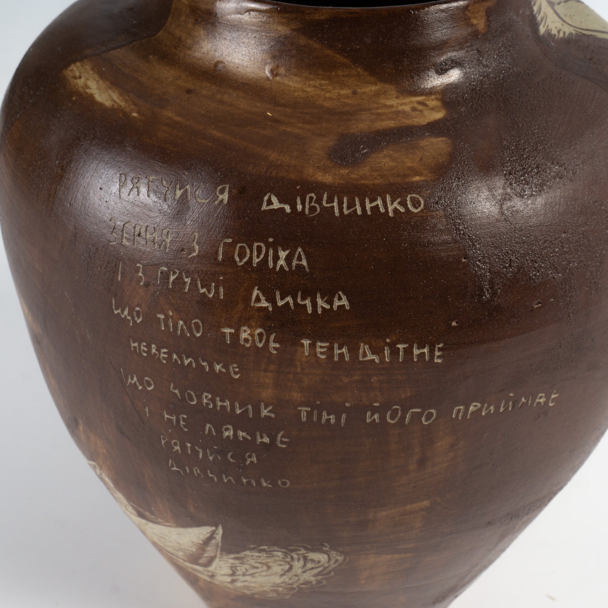 Ваза виконана в техніці молочіння, покрита матовою глазурʼю. Поверхня вази вручну розписана поетичним фрагментом та малюнками: