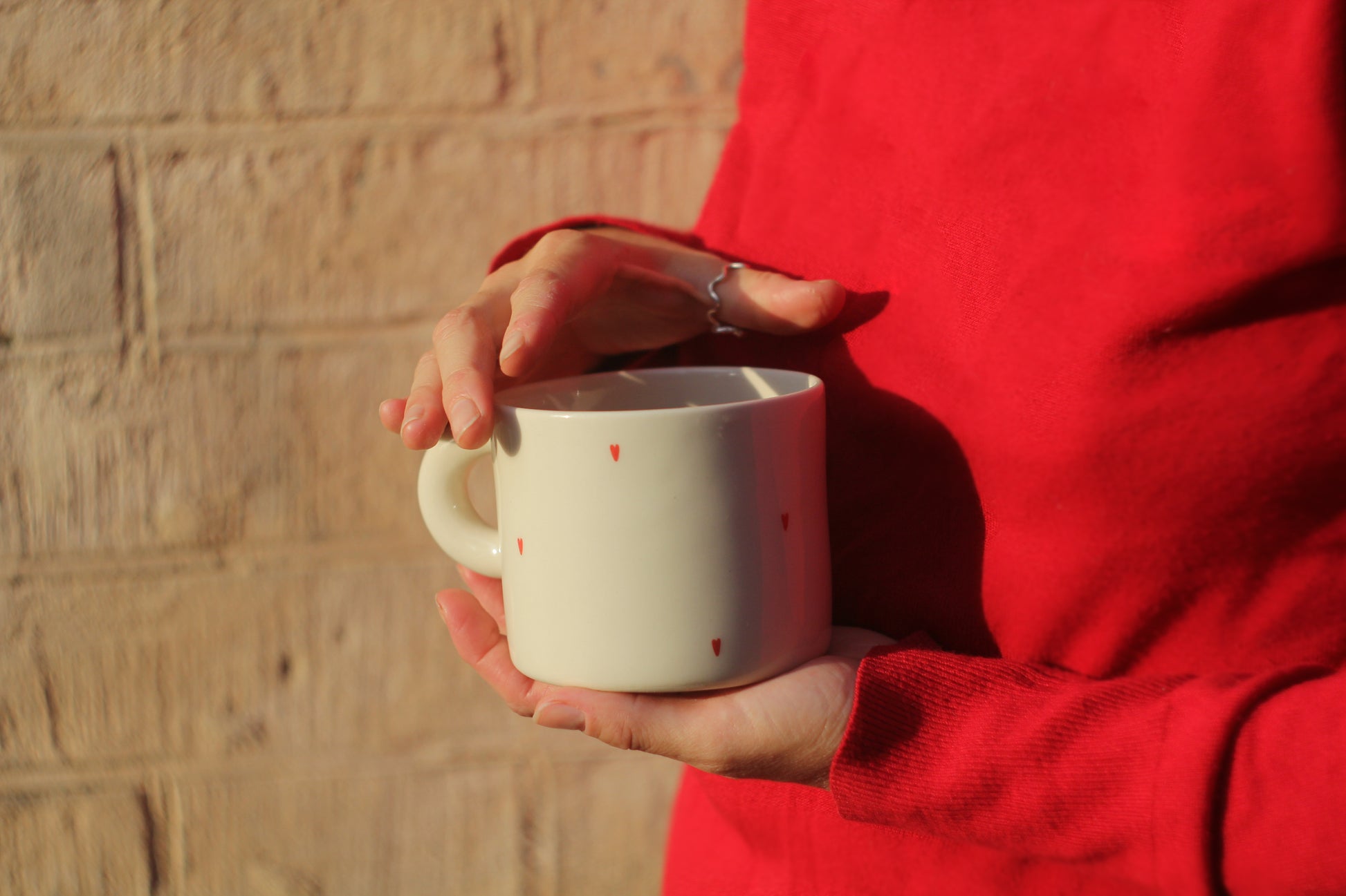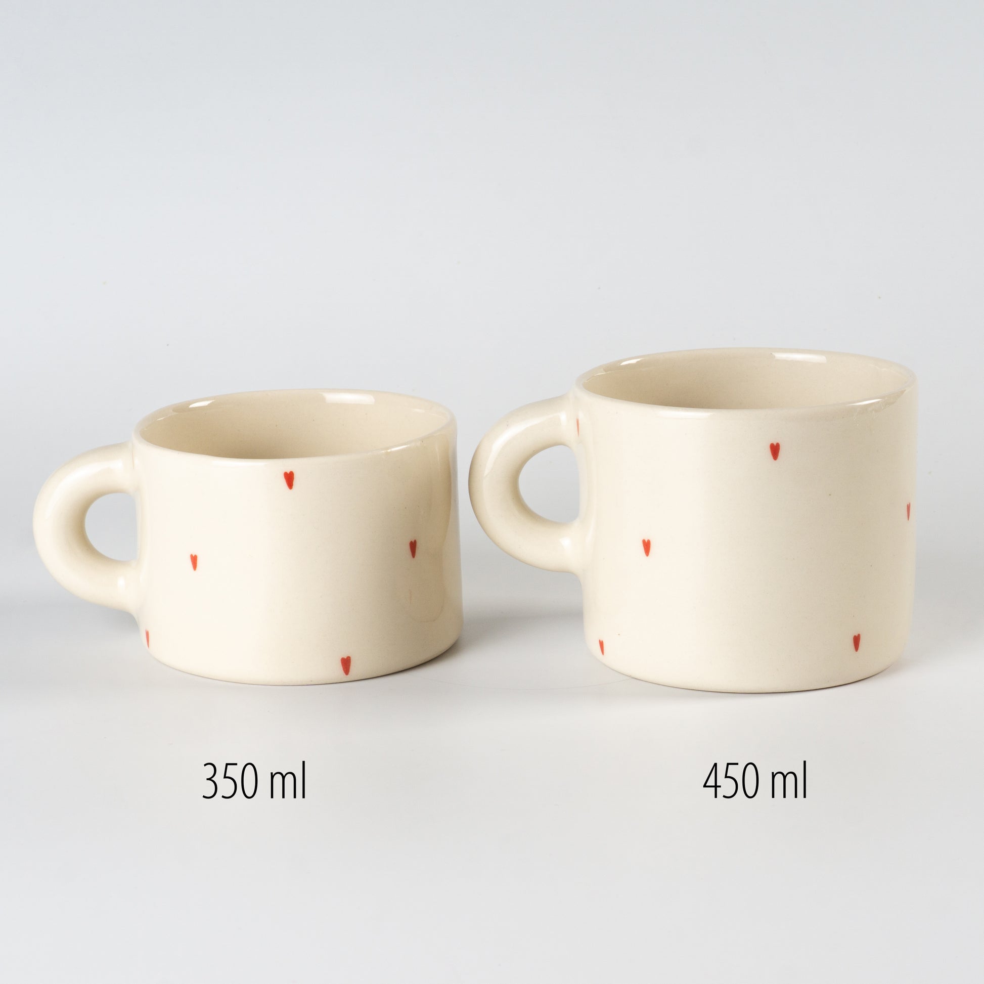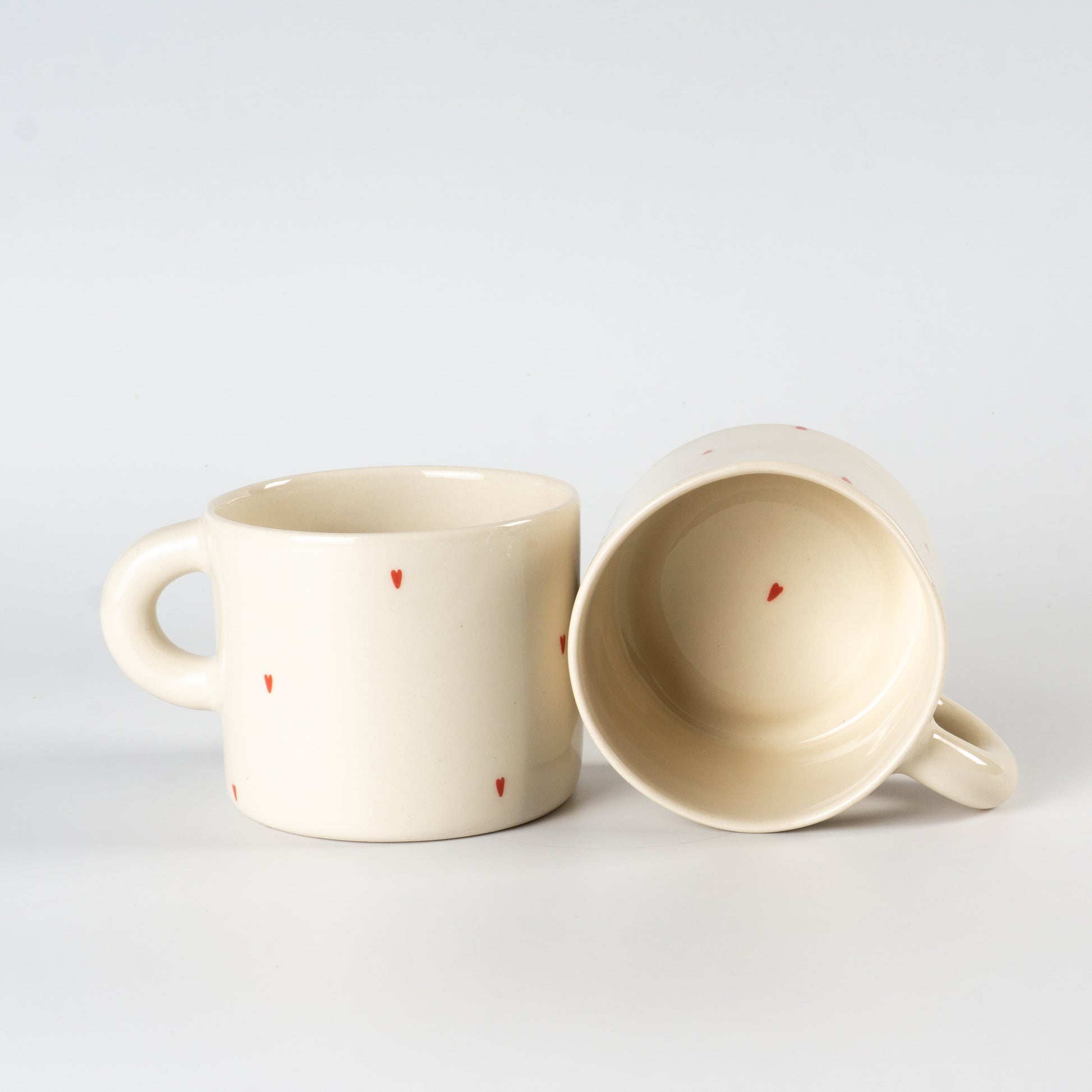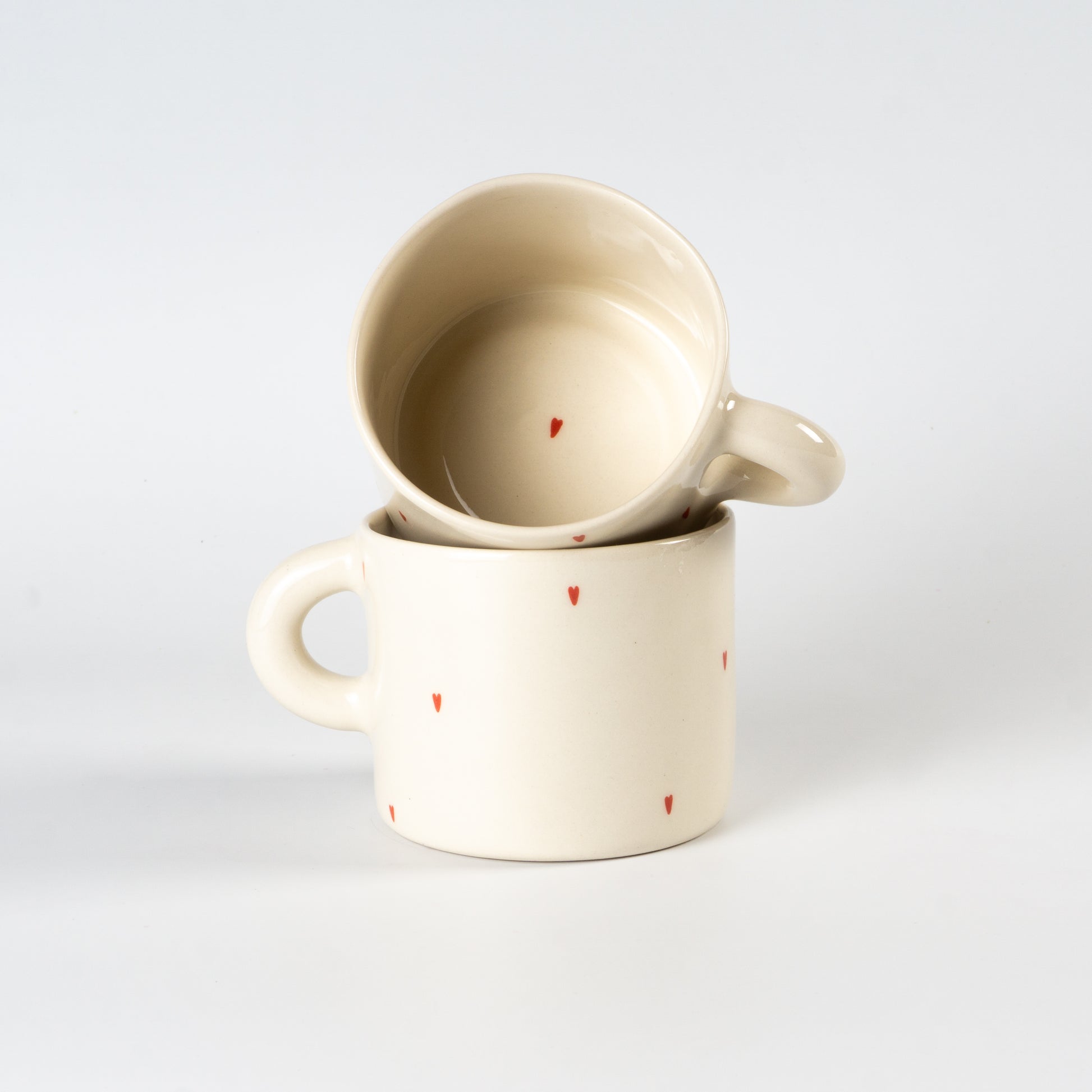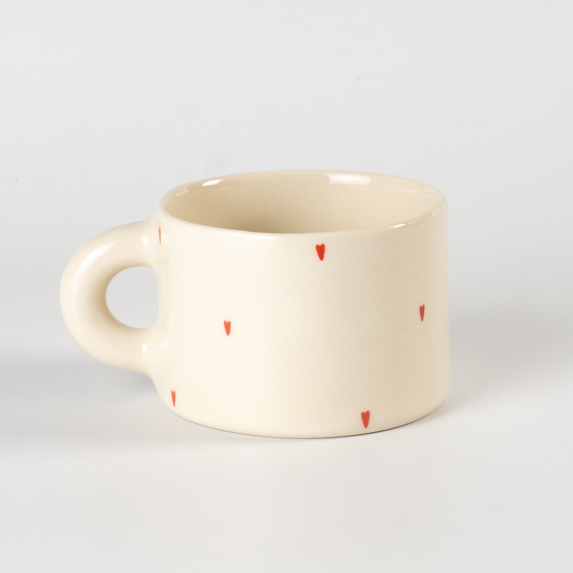 Світла півпорцелянова чашка в мінімалістичному стилі, прикрашена маленькими червоними сердечками. Покрита прозорою, безпечною для харчових продуктів глазур’ю — поверхня гладенька та приємна на дотик. Чиста форма, акуратний край і зручна ручка створюють ідеальний баланс стилю та функціональності.