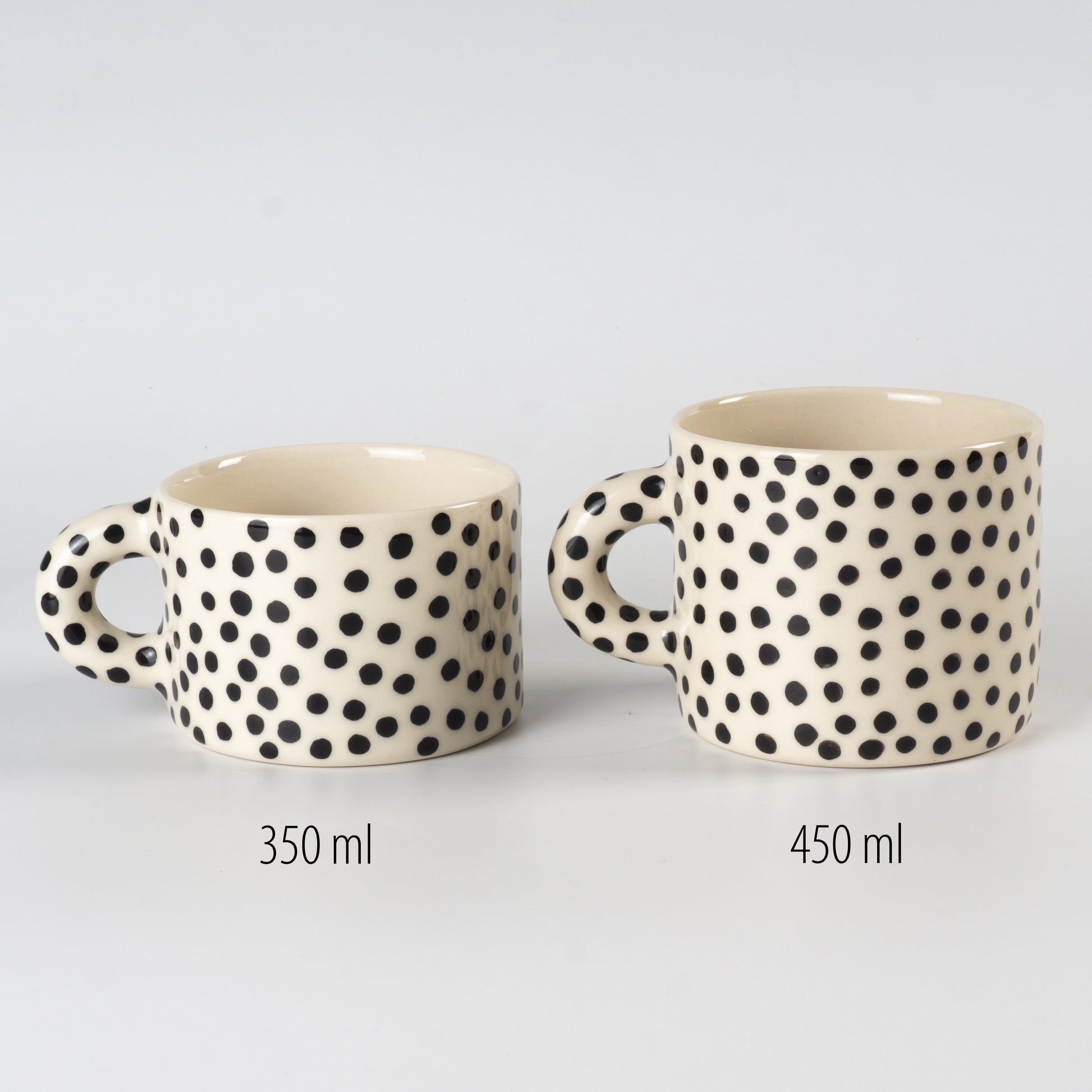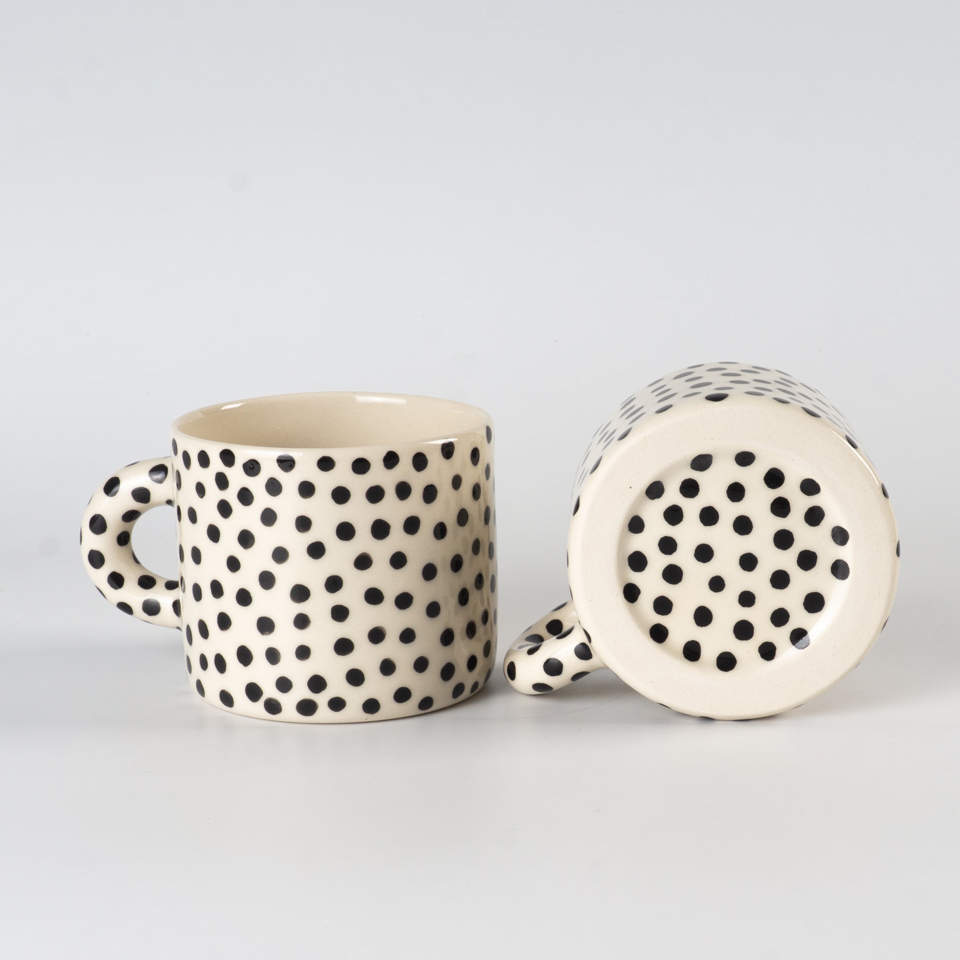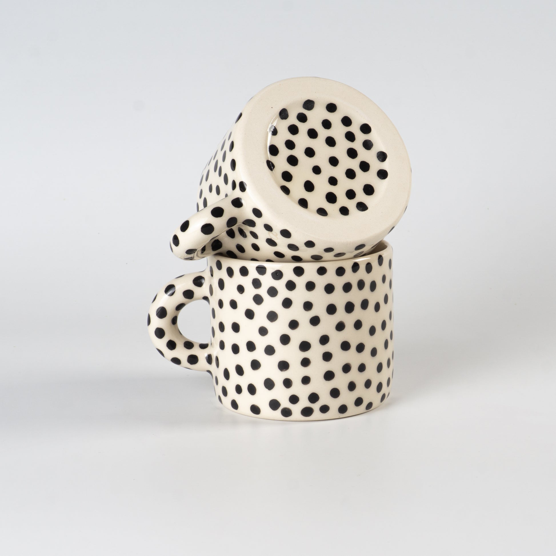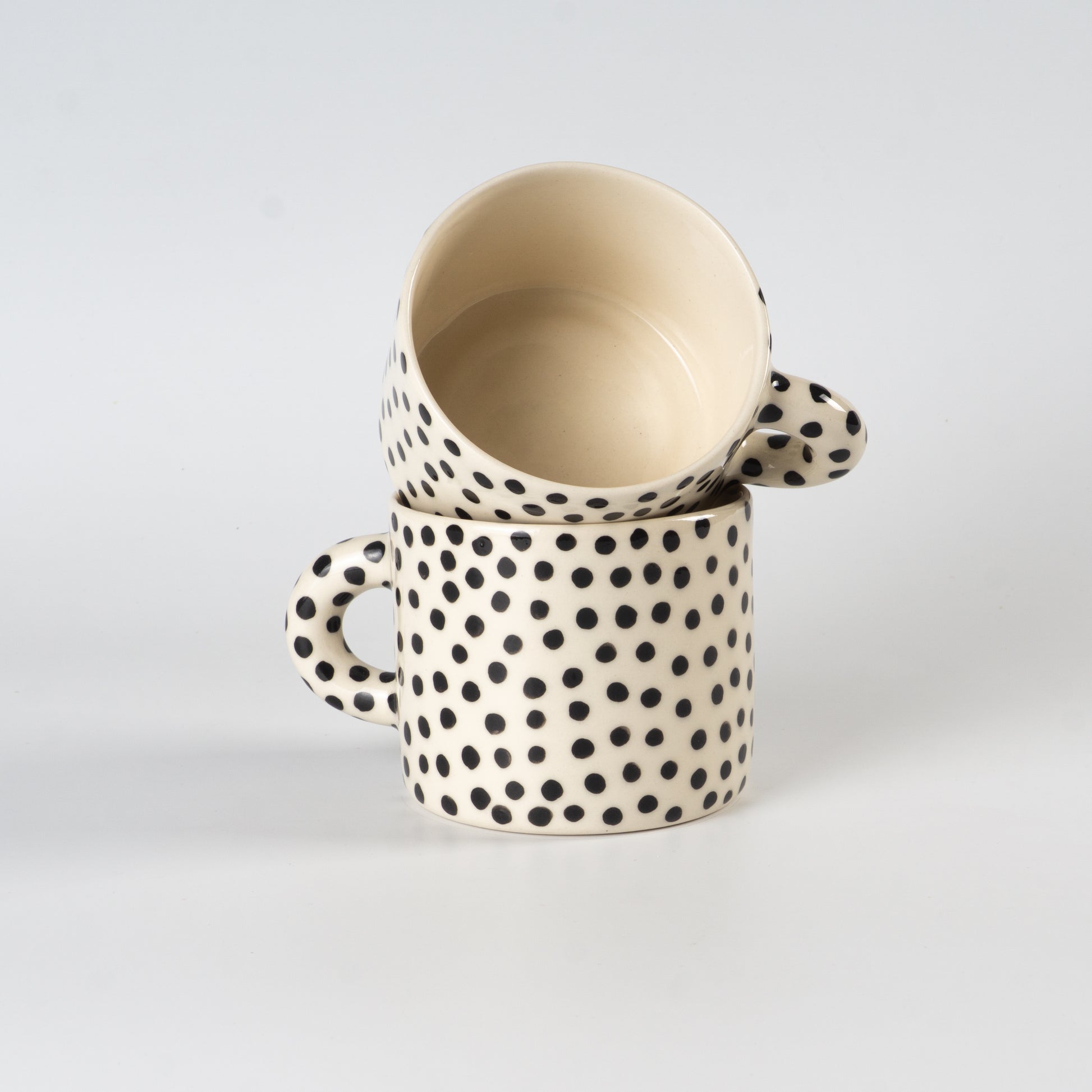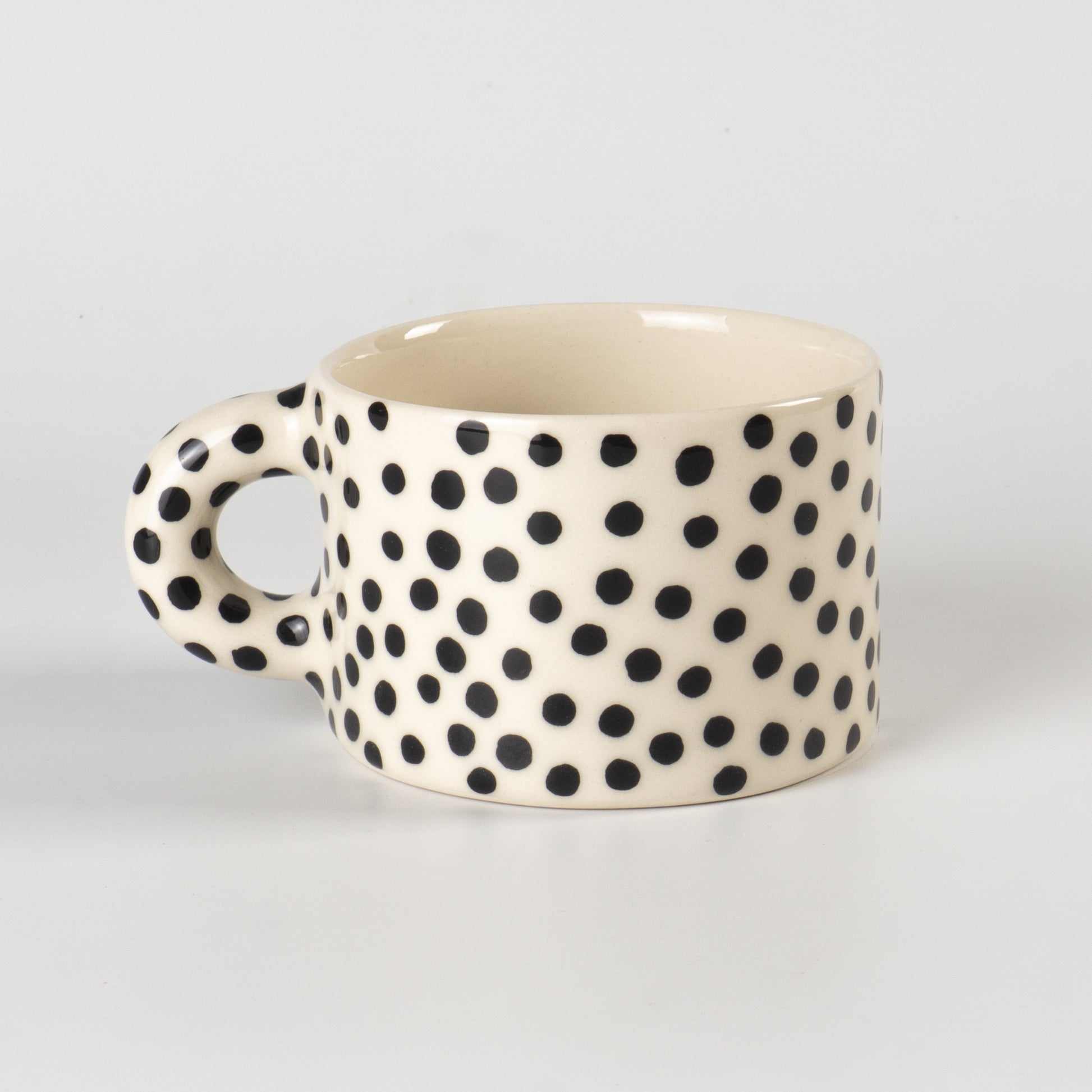 Світла півпорцелянова чашка в мінімалістичному стилі, розписана вручну крапочками. Покрита прозорою, безпечною для харчових продуктів глазур’ю — поверхня гладенька та приємна на дотик. Чиста форма, акуратний край і зручна ручка створюють ідеальний баланс стилю та функціональності.