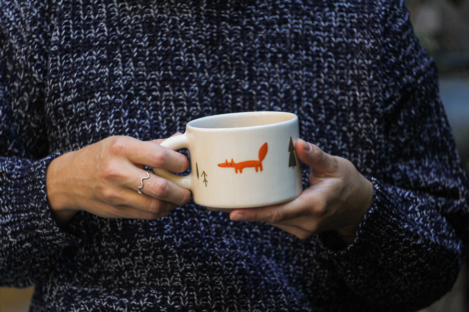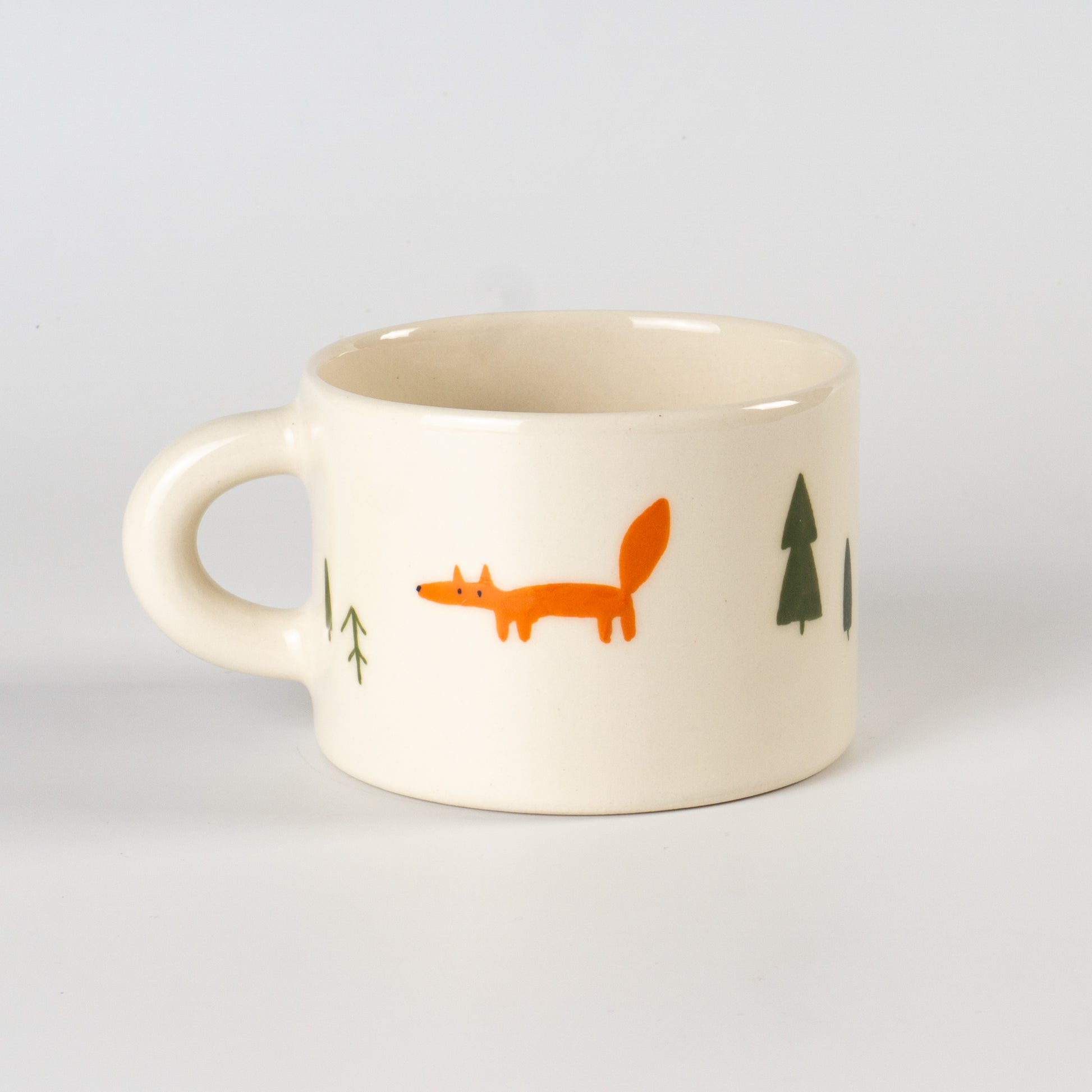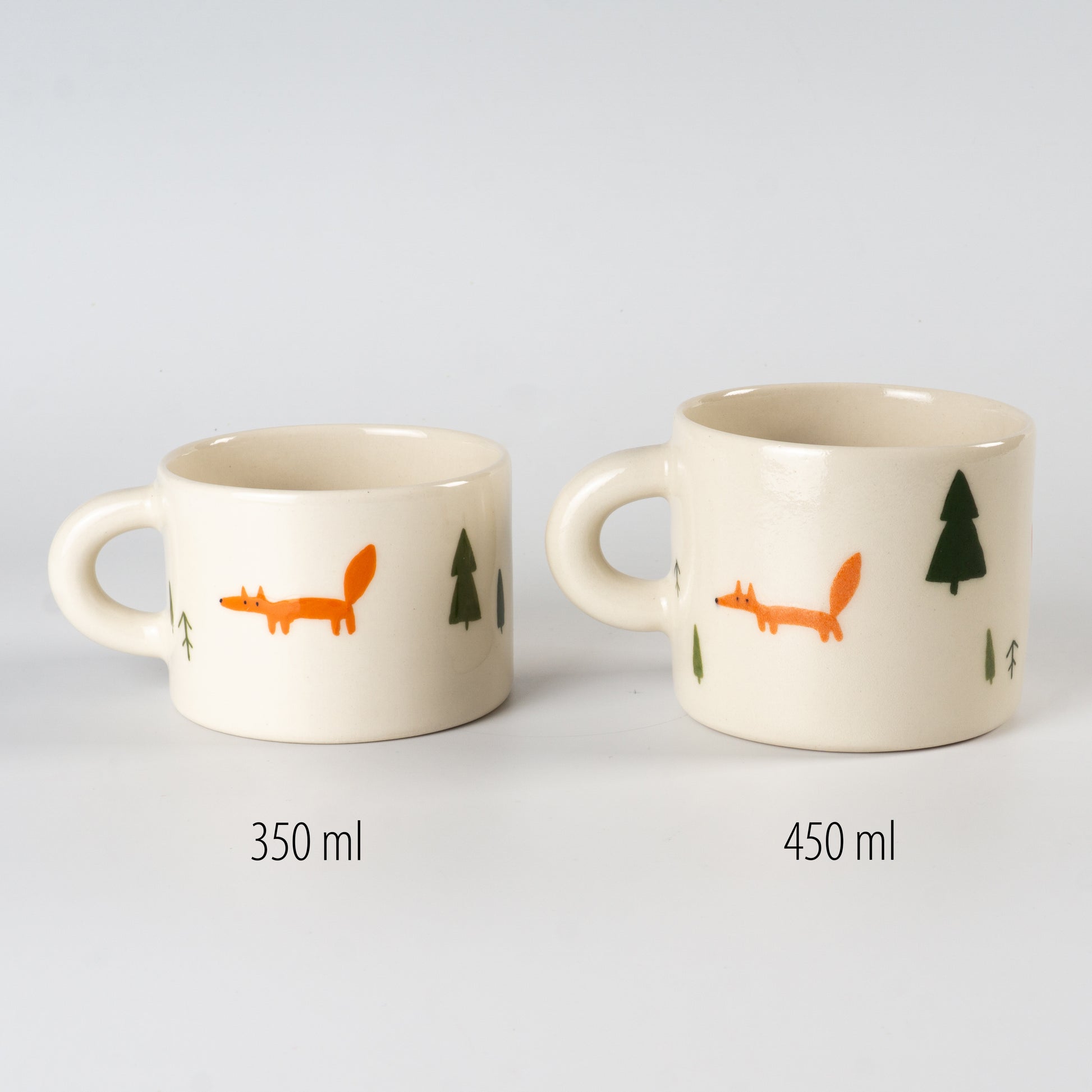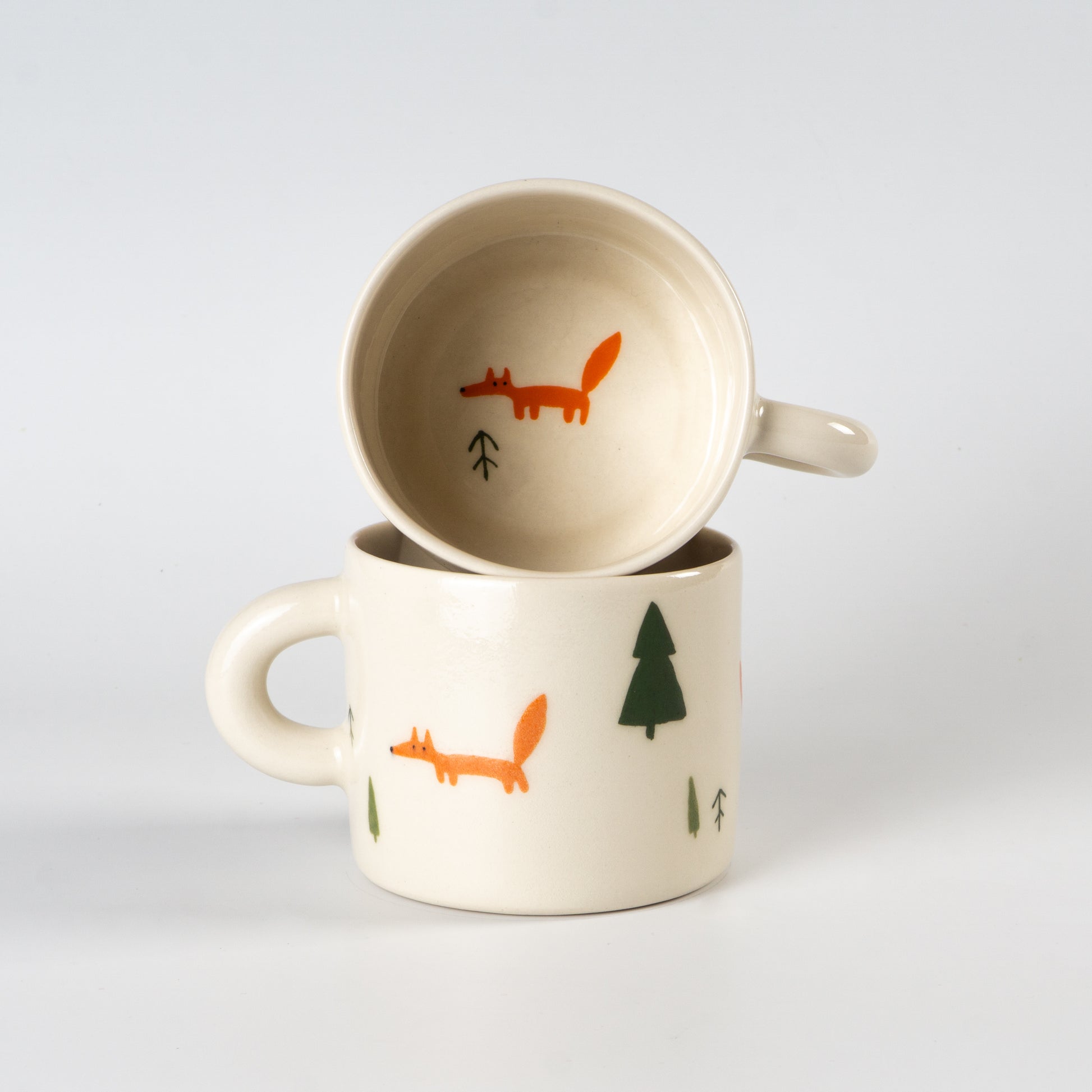 Світла півпорцелянова чашка в мінімалістичному стилі, розписана вручну лисичками та деревами. Покрита прозорою, безпечною для харчових продуктів глазур’ю — поверхня гладенька та приємна на дотик. Чиста форма, акуратний край і зручна ручка створюють ідеальний баланс стилю та функціональності.